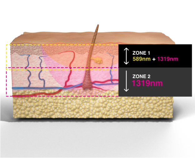 La onda 589nm penetra 1mm en el tejido mientras que la 1319nm alcanza 2mm mayor profundidad que cualquiera de los láser no ablativos más usados. Todo ello sin tiempos de recuperación ni dolor.