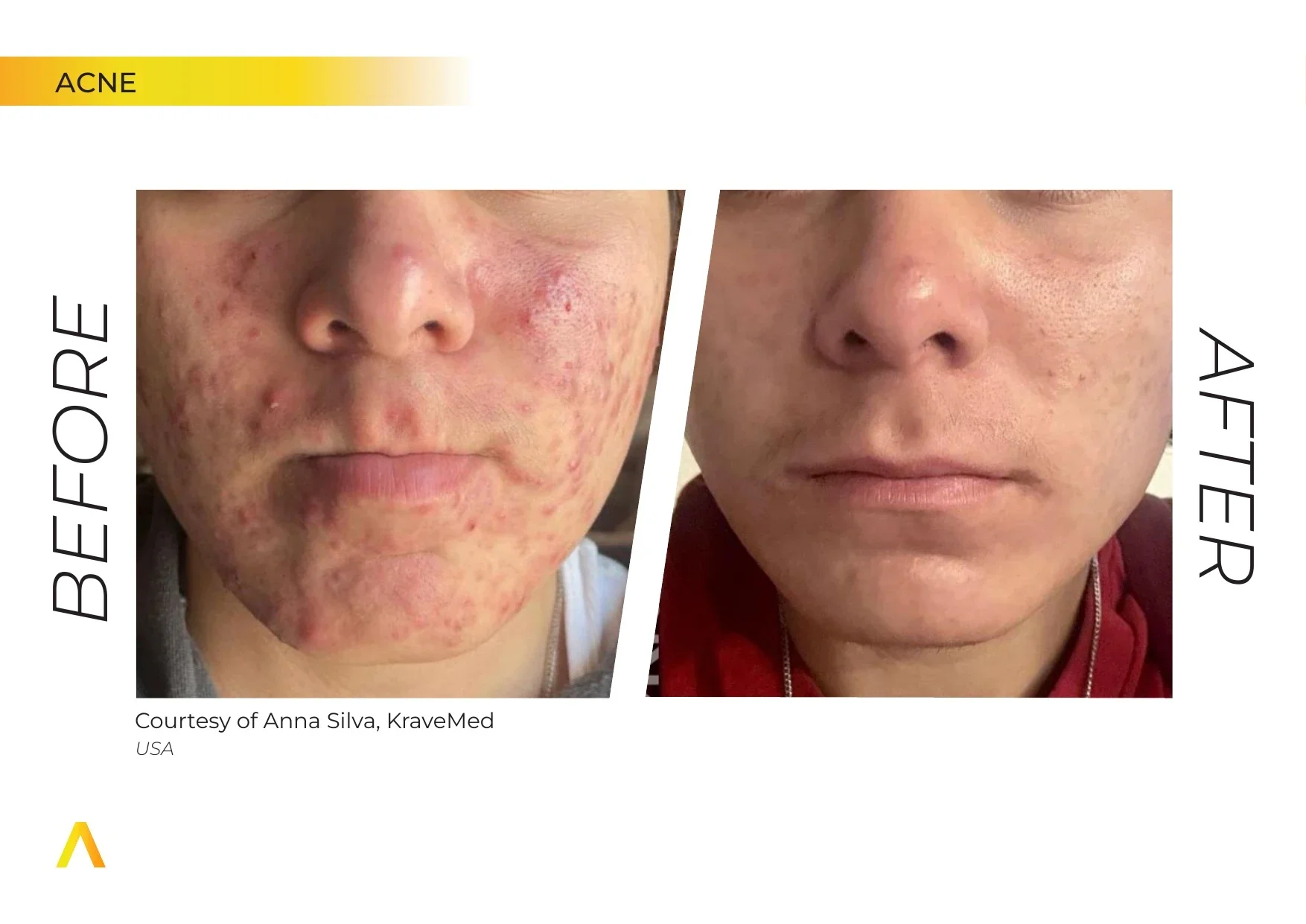 Acné activo y cicatrices de acné – actúa sobre la bacteria C. acnes, la inflamación y las glándulas sebáceas simultáneamente.